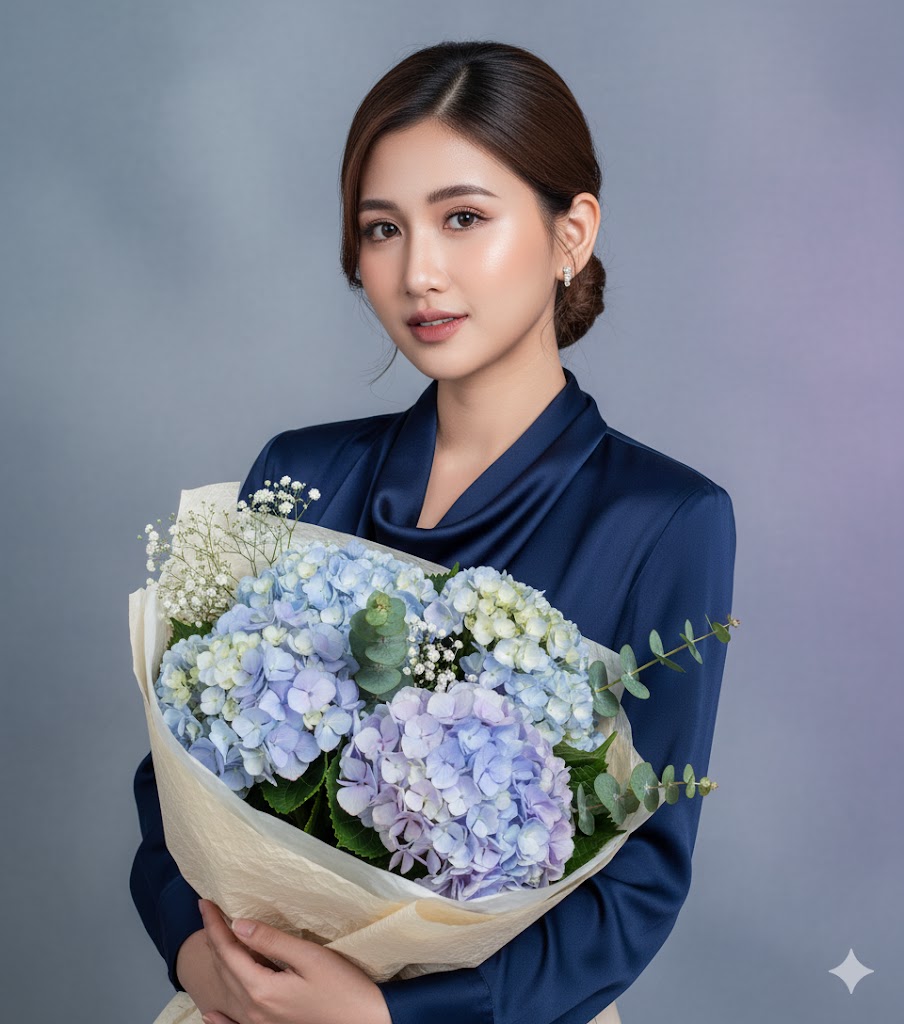 Đây là kết quả của mình khi tải ảnh gốc và câu lệnh tạo ảnh ôm hoa cẩm tú cầu với Gemini nhé !