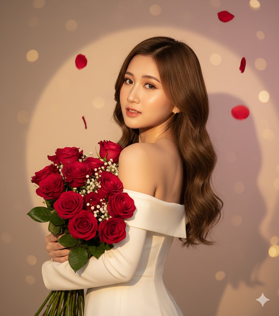 Đây là kết quả của mình khi tải ảnh gốc và câu lệnh tạo ảnh ôm hoa hồng với Gemini nhé !!! Quá đẹp phải không 🙂